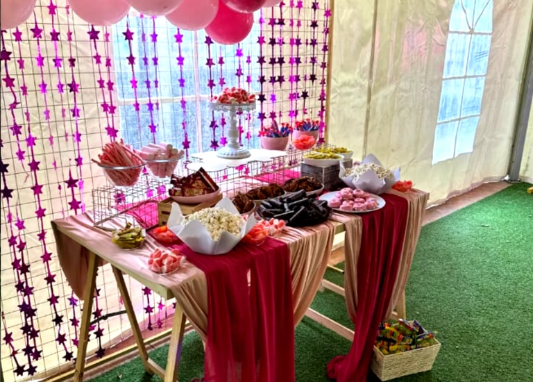 Incluye montaje completo y variedad de postres caseros deliciosos.